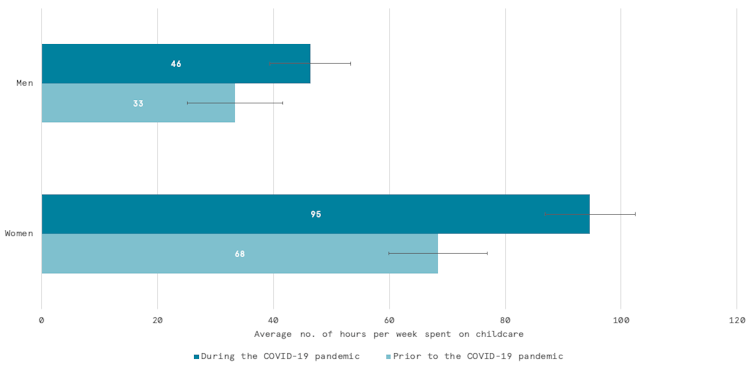 Even before COVID-19 triggered shelter-at-home measures, women with children at home reported spending more than twice as many hours on child care than men. Men reported an average of 33 hours per week spent on child care prior to the pandemic compared to 46 hours during the pandemic. Women reported spending 68 hours on child care on average in a given week before COVID-19 struck, and 95 hours thereafter.