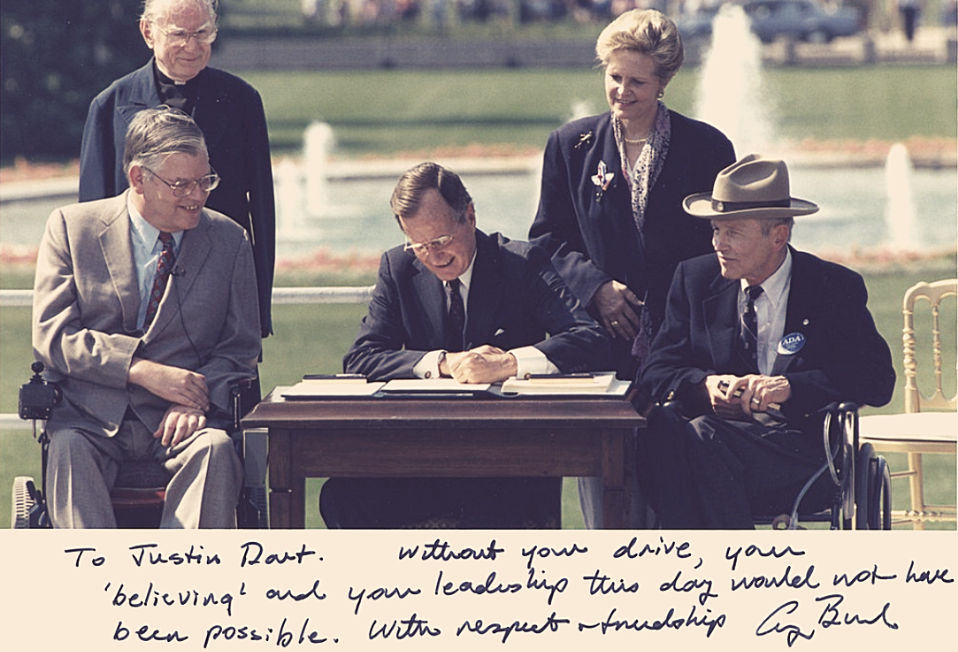 Photo of President George H. W. Bush signing the Americans with Disabilities Act inscribed to Justin Dart, Jr., 1990. Source: The National Museum of American History.