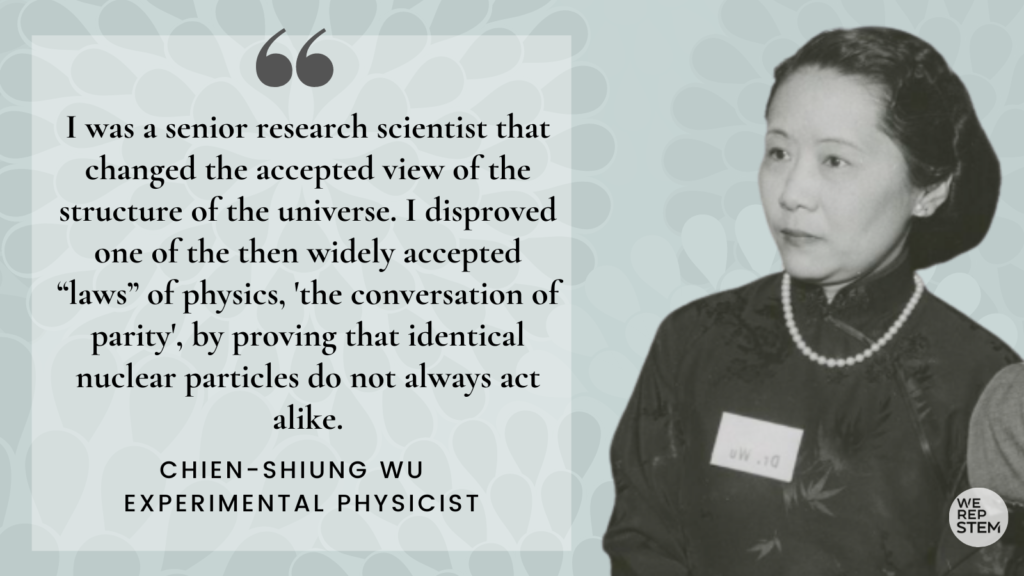“I was a senior research scientist that changed the accepted view of the structure of the universe. I disproved one of the then widely accepted “laws” of physics, ‘the conversation of parity’, by proving that identical nuclear particles do not always act alike.”
