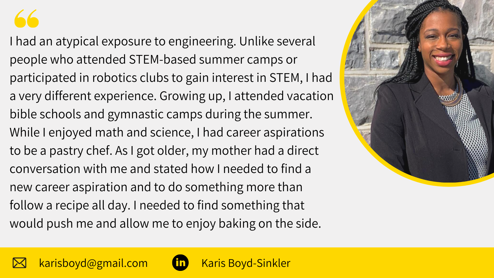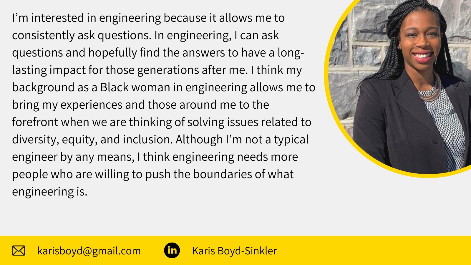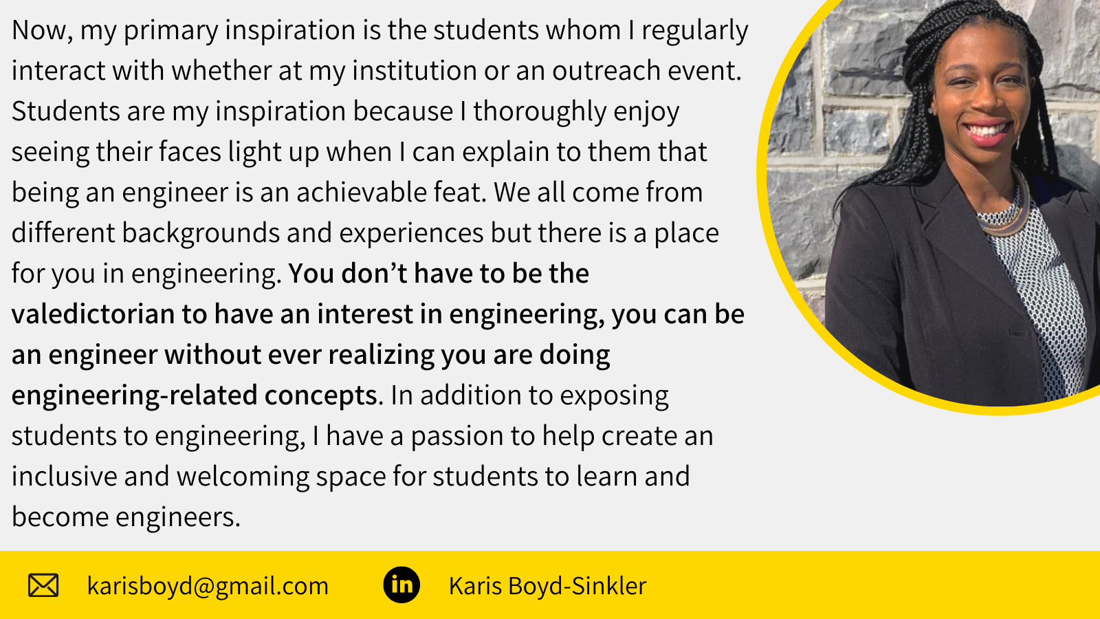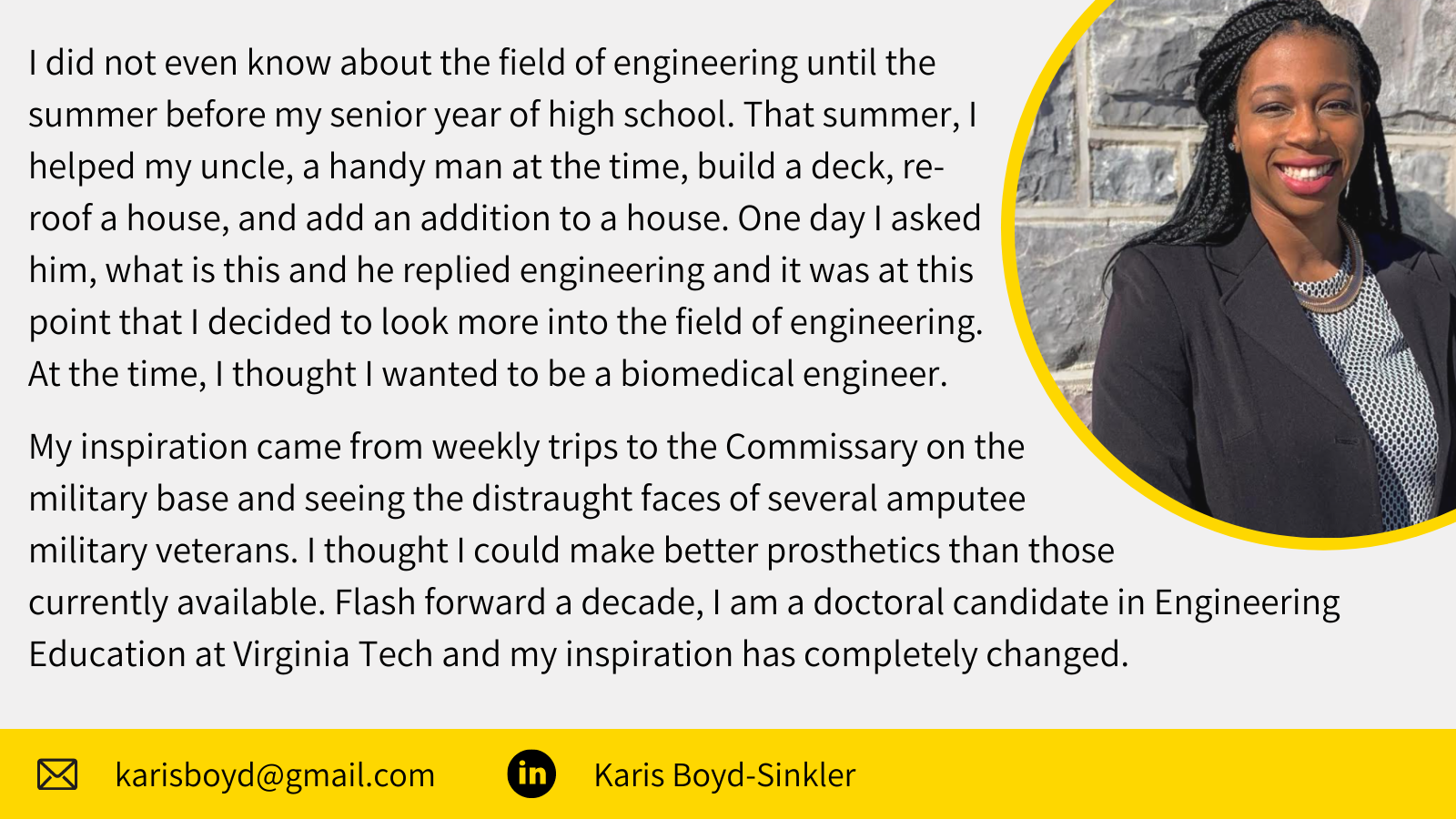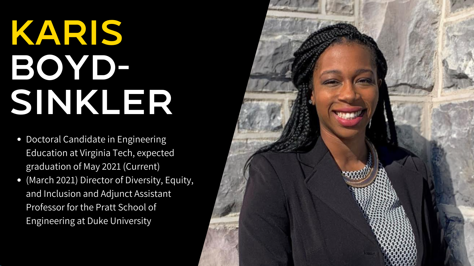 Karis Boyd-Sinkler is a Doctoral Candidate in Engineering Education at Virginia Tech, with an expected graduation of May 2021.