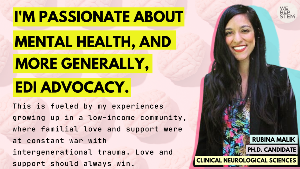 My name is Rubina (Ruby) Malik (She/Her), and I’m an Indo-Pakistani Canadian, originally from Scarborough, Ontario. I completed my undergraduate degree at McMaster University in the Arts & Sciences program and I have an MSc in social cognitive neuroscience.