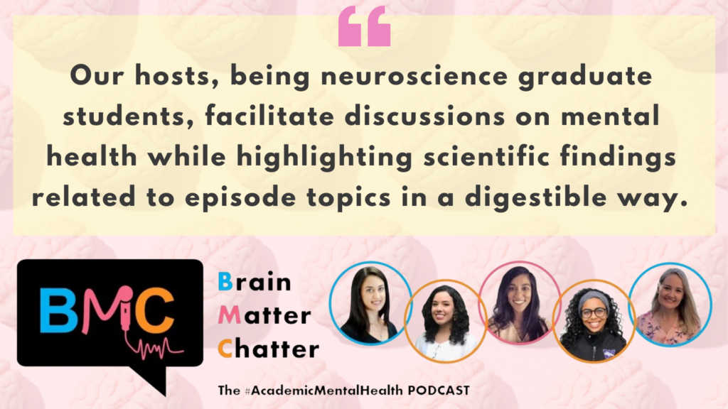 I started a podcast, called Brain Matter Chatter, to bring awareness to #AcademicMentalHealth. Brain Matter Chatter is unique in that it highlights student narratives, faculty perspectives, and expert advice on mental health, and includes a scicomm element to it as well.